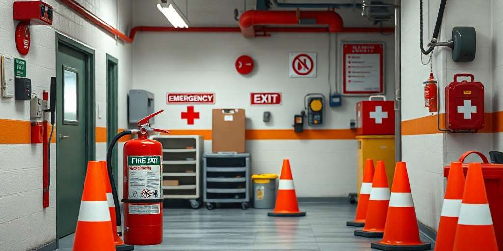 • Señales de advertencia y de seguridad necesarias para guiar a los trabajadores durante la evacuación.